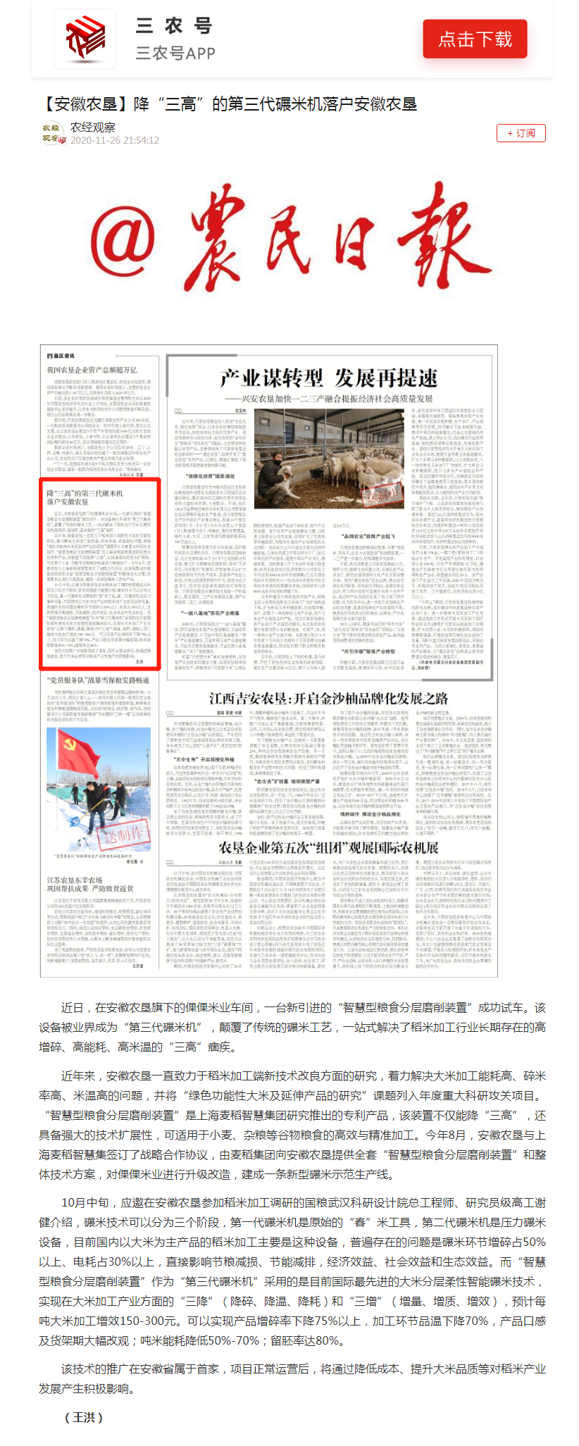 农民日报:降“三高”的第三代碾米机落户安徽农垦