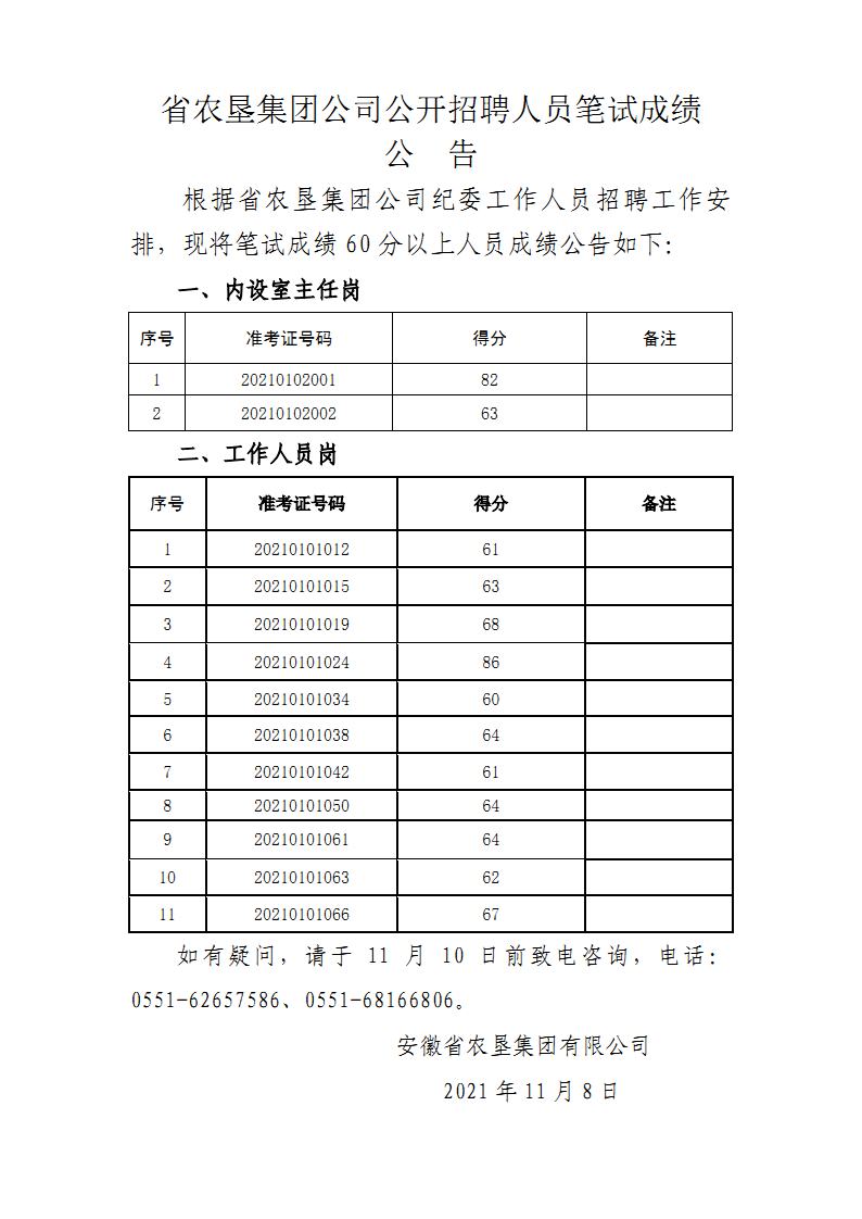 省农垦集团公司公开招聘人员笔试成绩公告