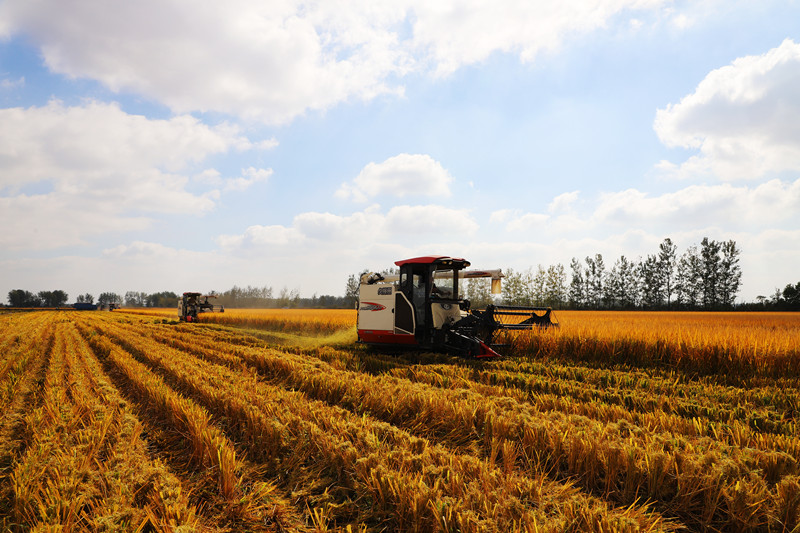 10月14日,潘村湖农场公司第二农业分公司统一经营田水稻开镰收割。