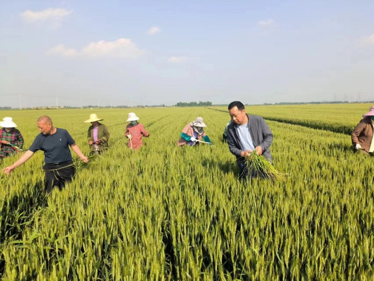 5月7日,在潘村湖农场公司第三农业分公司统一经营田,党员管理人员正带领职工群众开展麦田去杂作业。