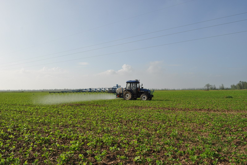 ,在安徽潘村湖农场,大马力拖拉机正在田间进行除草作业。(安徽日报