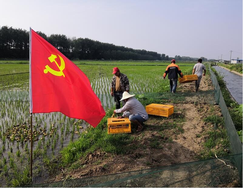 6月10日是农业第一管理区党支部每月一次的党员固定活动日,只见一大早,有机稻田边党旗招展,党员们穿梭忙禄。为了能参加这次活动,他们放下自家田里繁忙的农活,主动请缨,接下投放鸭苗的任务。大家按照分工两人一组将鸭苗分配到十块田,并逐个过数,确保鸭苗数量和质量符合要求。稻田里,完成投放的近2000只小鸭苗在秧苗中间来回自由穿行,时而专心啄草觅食,时而欢快追逐嬉戏,好不惬意。(大圹圩农场公司陈刚)
