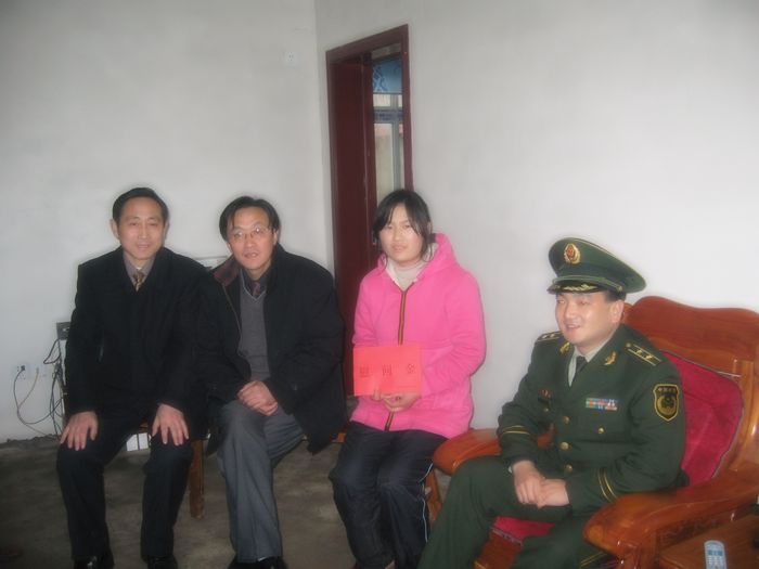 2月10日下午,安庆市大观区消防大队刘强大队长一行三人,受安徽省消防总队的委托,在副场长汪丙来、党委委员、组织人事科科长刘和奎等陪同下,前往皖河农场三益分场慰问“江淮十佳少年”斯江萍,将2000元慰问金送到斯江萍手中。刘大队长说:这是省消防总队开展的百户危困家庭帮扶活动,斯江萍系省总队结队帮扶的对象之一。刘大队长向斯江萍同学及全家致以节日的问候和新春的祝福,并勉励她要克服困难,努力学习。斯江萍代表全家对消防大队领导的关心和帮助表示衷心感谢,且表示一定要刻苦学习,将来回报社会。