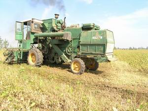 图片说明:为改良土壤,培肥地力,提高农作物产 量水平,安徽省潘村湖农场拨出10万元专款,在今 年秋收中大力推广大豆秸杆还田技术。全场3.2万 亩大豆收获后,全部实现了秸杆还田。图为带有秸 杆粉碎装置的大马力收割机正在田间作业。(杨登 宏)