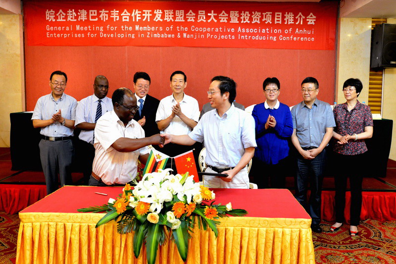 人民网合肥625日电(记者 刘甜甜)  安徽大学与津巴布韦共建孔子学院、安徽农业大学与津国奇诺伊大学联合培养研究生、安粮与津国联合开展农产品加工贸易、淮北企业在津投资木材加工……今天下午,安徽农垦集团牵头在合肥召开的皖企赴津巴布韦合作开发联盟会员大会暨投资项目推介会上,又一批项目的手拉手,标志着皖企抱团出海再次迈出坚实的步伐。