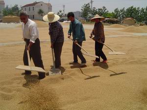 近日,龙亢农场职工抓住晴好天气凉晒小麦良种,确 保小麦良种的质量。图为二分场职工凉晒场面。 (龙亢农场 邵乃昌)